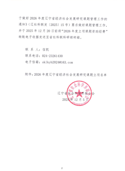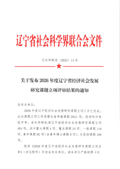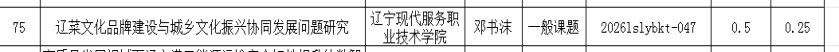 近日,辽宁省社会科学界联合会发布了2026年度辽宁省经济社会发展研究课题立项名单,此次课题全省累计申报2021项。省社科联批准辽宁省经济社会发展研究课题立项404项,其中高职院校项目仅4项,我校教务处处长邓书沫主持的《辽菜文化品牌建设与城乡文化振兴协同发展问题研究》获批立项,资助经费0.5万元。