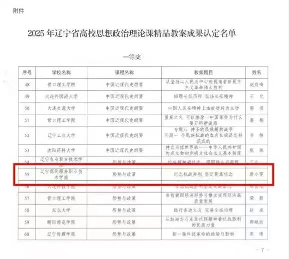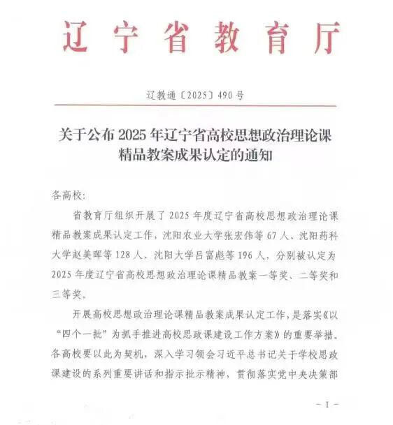 近日,辽宁省教育厅公布2025年辽宁省高校思想政治理论课精品教案获奖名单,我校马克思主义学院教师凭借扎实的教学积淀与创新的教学设计脱颖而出,斩获两项殊荣:唐小雯老师申报的《形势与政策》课程教案荣获一等奖,杜志会老师申报的《习近平新时代中国特色社会主义思想概论》课程教案获评三等奖。
