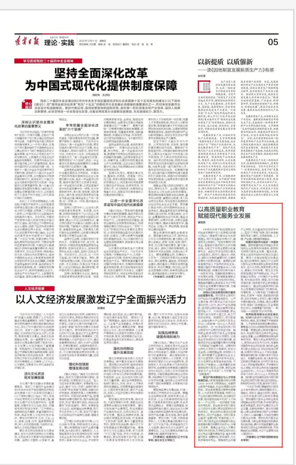 《中共中央关于制定国民经济和社会发展第十五个五年规划的建议》指出:“提高现代服务业与先进制造业、现代农业融合发展水平,推进服务业数智化。”加快发展现代服务业,是推进中国式现代化的关键举措,也是辽宁实现全面振兴的重要支点。当前辽宁正经历现代服务业向品质化、数字化、融合化、绿色化、国际化发展的重要阶段,对高技能劳动力的需求旺盛。高等职业教育是高技能人才培养的供给主体,要通过推动产教深度融合与人才供需精准匹配、构建区域协同与城乡一体服务网络、完善制度保障与长效发展机制等,不断增强高等职业教育领域改革的系统性和协同性,确保高质量职业教育体系与辽宁现代服务业发展需求精准对接,为推动辽宁全面振兴夯实基础。