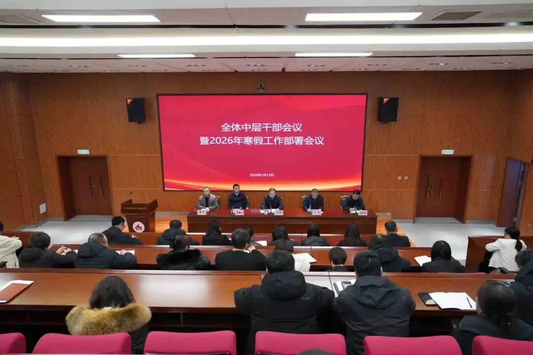 1月13日下午,我校在行政楼学术报告厅召开全体中层干部会议。会议紧扣2026年全国教育工作会议精神,立足“十五五”开局之年的战略定位,全面总结2025年发展成效,部署2026年寒假重点工作,为学校高质量发展明确方向、凝聚合力。全体校领导出席会议,党委书记王斌,党委副书记、校长卢全分别讲话。全体中层干部参加会议。