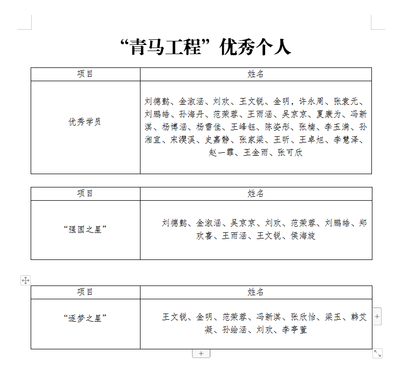 团委张焱老师宣读《关于表彰第十期青年马克思主义者培养工程大学生骨干培训班优秀个人的决定》《关于表彰第五期团务知识培训班优秀学员的决定》,经团总支申报,团委审核,决定授予刘德懿等30名同学“青马工程”优秀学员荣誉称号、授予金淑涵等10名同学“强国之星”荣誉称号、授予王文锐等10名同学“逐梦之星”荣誉称号、授予范荣蓉等25名同学第五期团务知识培训班“优秀学员”荣誉称号。
