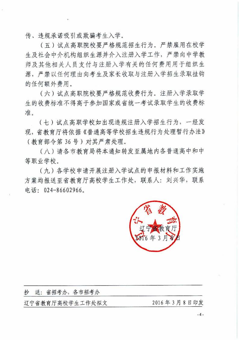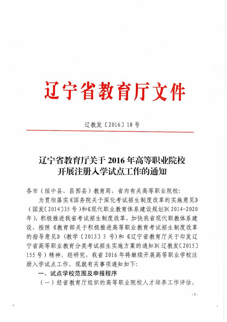 辽宁省教育厅 关于2016年高等职业院校开展注册入学试点工作的通知 (信息来源:辽宁省教育厅网站)
