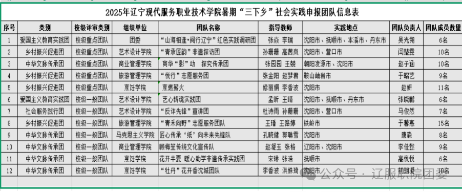 为深入学习贯彻习近平新时代中国特色社会主义思想,全面落实党的二十大及二十届二中、三中全会精神,切实践行习近平总书记关于青年工作的重要思想,我校广泛组织青年学生投身乡村与基层一线开展社会实践。2025年辽宁现代服务职业技术学院大学生暑期社会实践活动申报立项工作启动以来,得到全校同学的热烈响应与积极参与。经各学院初评推荐、校团委综合评审,最终确定 12 支团队为 2025 年暑期“三下乡”社会实践项目团队: