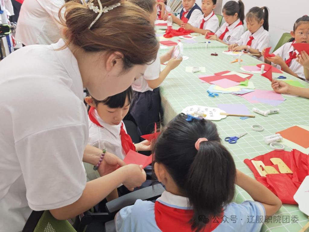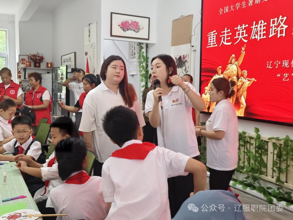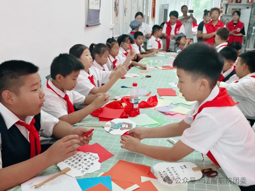 次日,团队与抚顺市望花区爱心公益志愿者协会联动,在志愿者中心举办“童心心向党,爱心护成长——爱老兵敬功臣庆八一”活动。其中向阳花学堂的30余名孩子参与其中。“艺”心铸魂实践团的学生指导向阳花学堂的孩子们制作红色主题折纸,绘制红色主题图案的扇面。在活动中,还进行了党史知识问答小问答和红歌传唱等一系列活动,引发孩子们的热烈反响。活动结束后队员们采访了莅临现场的援越抗美老兵代表金巨友和胡宝文,进行了一场跨越时空的青春对话。实践团学生们倾听老兵讲述当年抗战故事,传承红色精神。