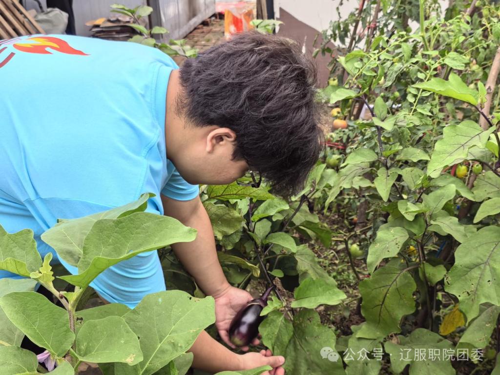 图为 实践团成员中餐烹调专业王旭同学实地调研茄子、西红柿等作物的生长情况,为乡村食堂构思新菜谱。修丽娟供图