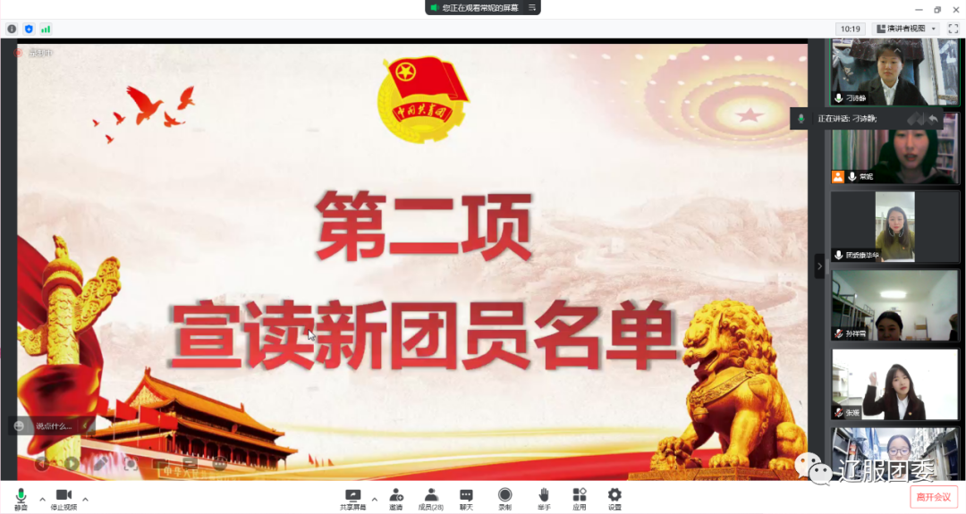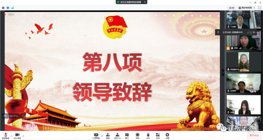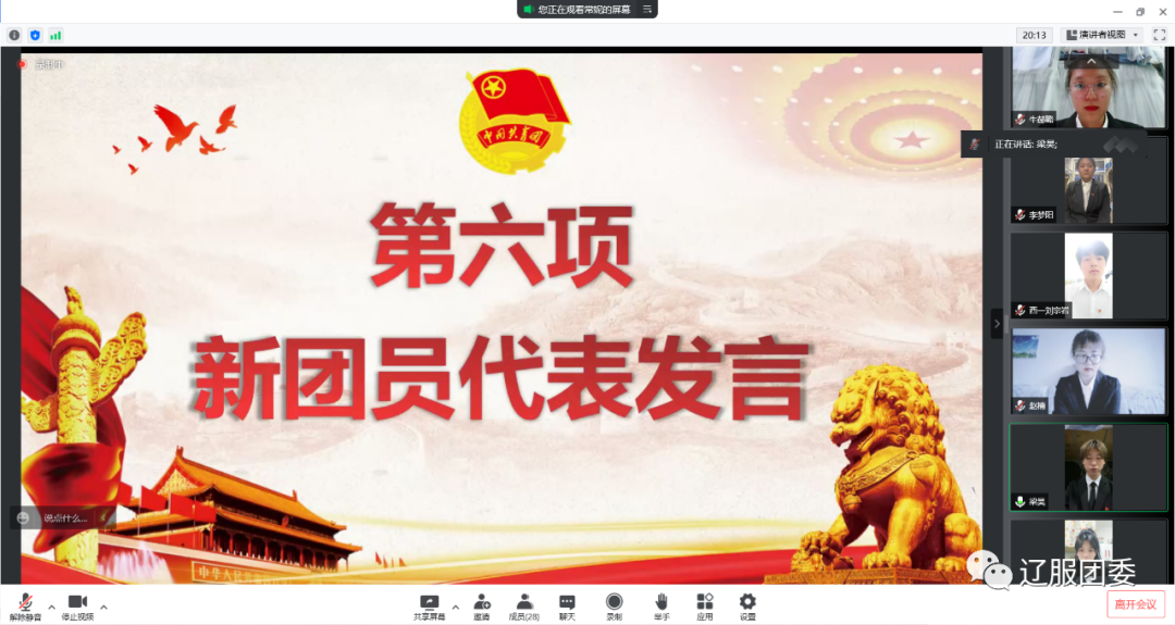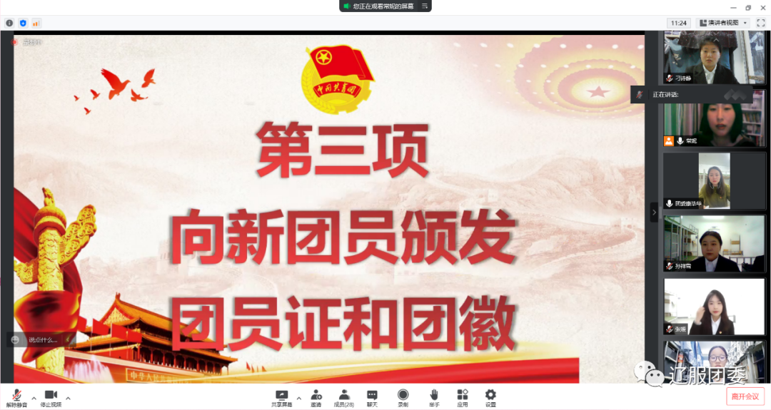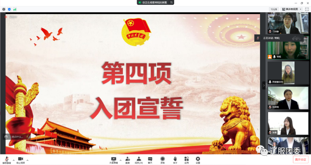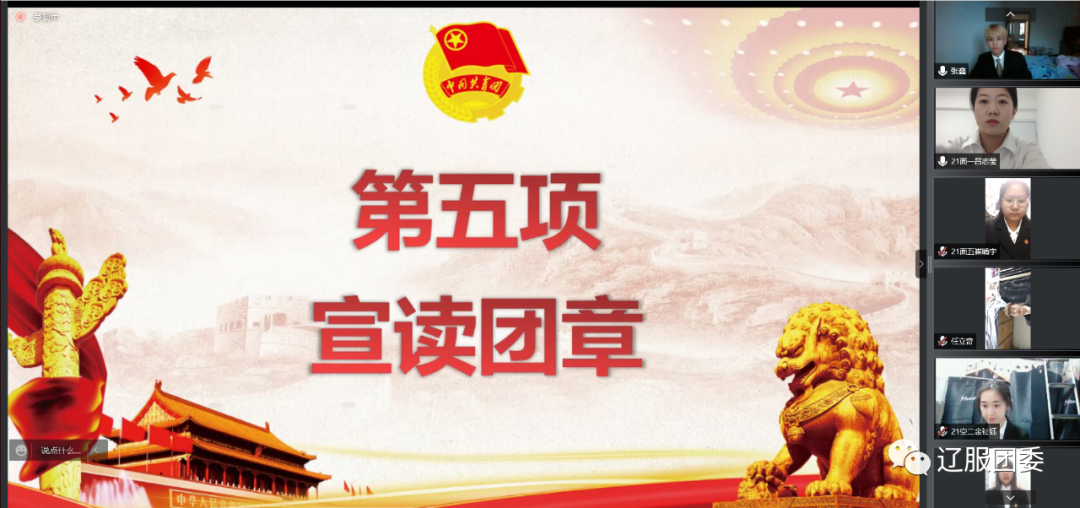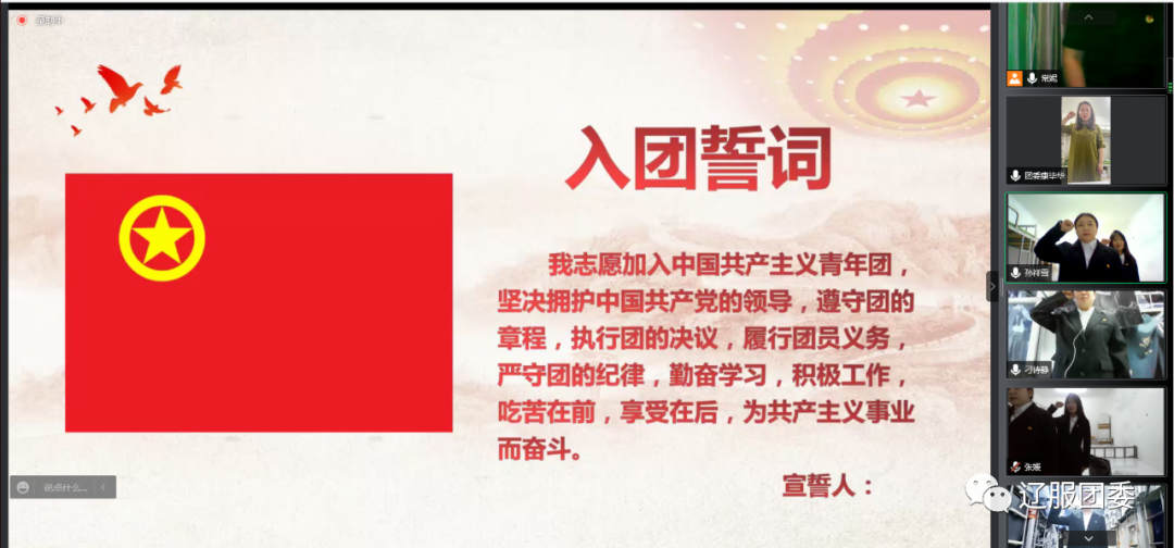 本次入团仪式正值中国共产主义青年团成立100周年之际,这一百年来,中国共青团始终与党同心、跟党奋斗,组织引领一代又一代团员青年传承发扬五四精神,树立热爱祖国、奉献社会,服务人民的信念,用实际行动绽放新时代团员青年风采,为实现中华民族伟大复兴而不懈奋斗着。相信在未来的学习与生活中新团员将以更高、更严的标准来要求自己,以身作则,发挥表率作用,辽服学子一定能接过时代的接力棒,领跑在社会主义现代化建设的前列!成为奋进者、开拓者、奉献者,带着新的目标,乘风破浪,扬帆起航。